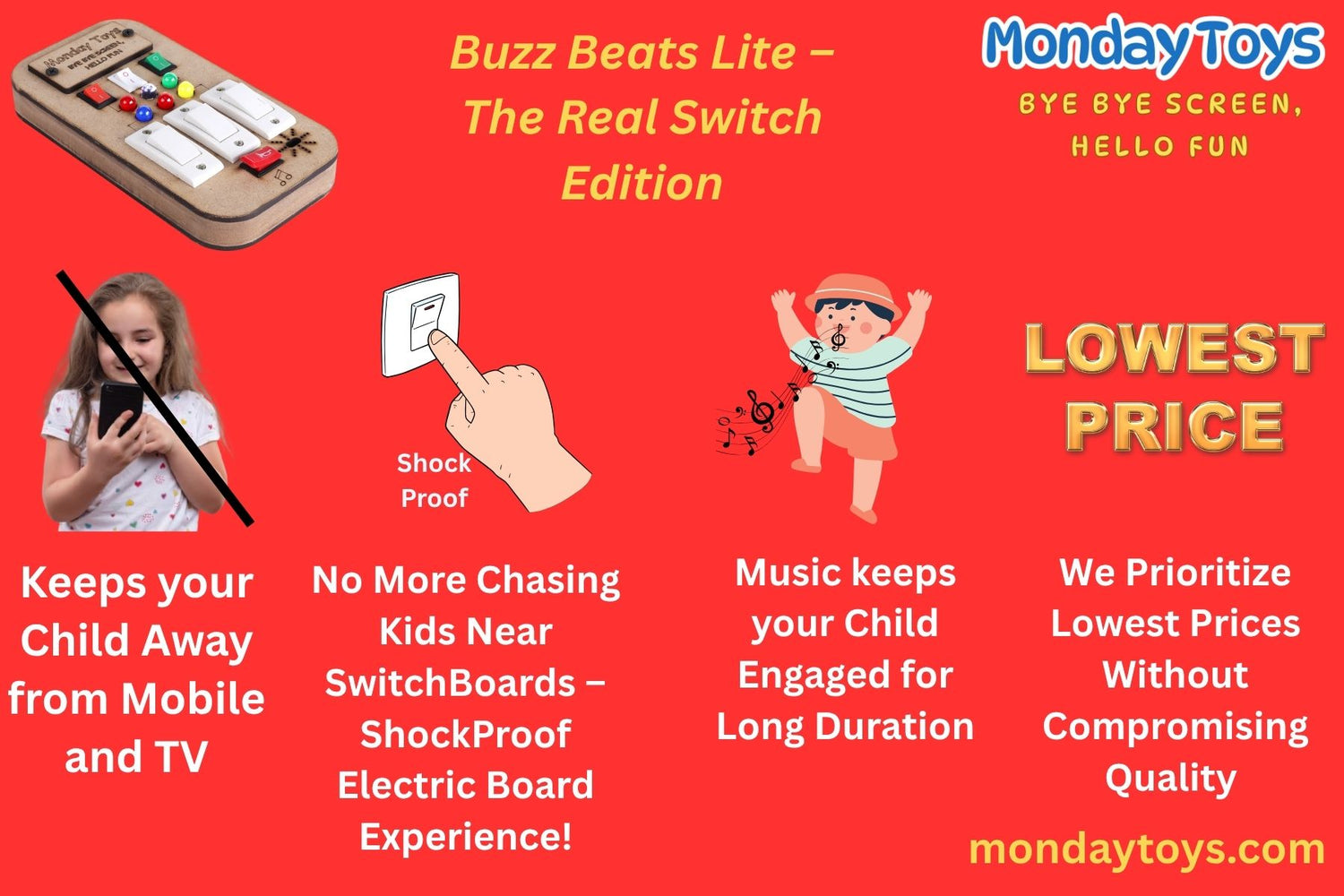 Buzz Beats Lite is a Made in India Montessori toy that encourages toddlers to explore through real-feel electric-style switches and 6 musical tunes, now available in a budget-friendly version.